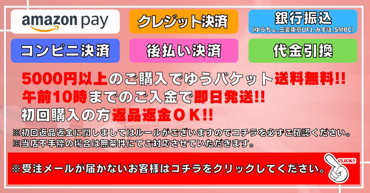 更新情報 2025年08月17日 【後払い決済の対応時間について】 2025年04月18日 【重要】ご入金の情報につきまして 2024年07月29日 【重要】「outlook」「hotmail」を含むメールアドレスのご利用について 2024年05月14日 [重要]ご注文の即日発送受付時間変更のお知らせ 2024年04月20日 一部商品のお支払い期日につきまして 2022年09月05日 【重要】当店からのメールが届かないケースにつきまして 2022年07月21日 領収書等の発行につきまして