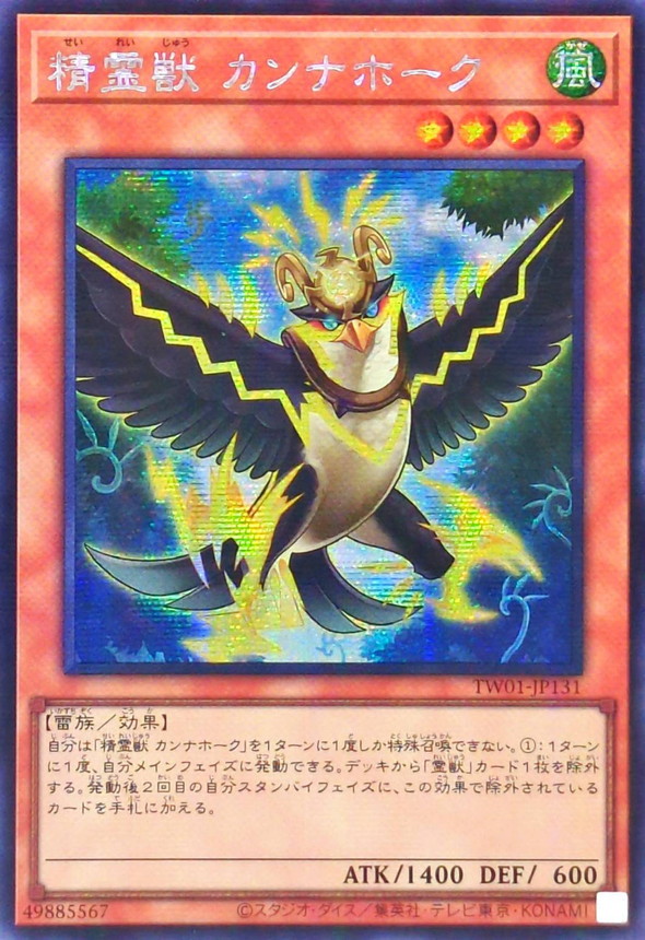 精霊獣 カンナホーク 効果モンスター 星4/風属性/雷族/攻1400/守 600 自分は「精霊獣 カンナホーク」を1ターンに1度しか特殊召喚できない。 (1):1ターンに1度、自分メインフェイズに発動できる。 デッキから「霊獣」カード1枚を除外する。 発動後2回目の自分スタンバイフェイズに、この効果で除外されているカードを手札に加える。 ※状態表記に関しては「カードの状態表記について」をご覧ください。 ※初めてご購入の方は「カードの梱包方法について」を必ずご覧ください。