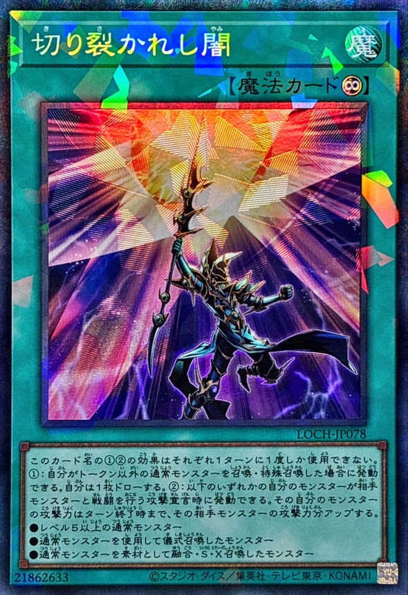 切り裂かれし闇 永続魔法 このカード名の(1)(2)の効果はそれぞれ1ターンに1度しか使用できない。 (1):自分がトークン以外の通常モンスターを召喚・特殊召喚した場合に発動できる。 自分は1枚ドローする。 (2):以下のいずれかの自分のモンスターが相手モンスターと戦闘を行う攻撃宣言時に発動できる。 その自分のモンスターの攻撃力はターン終了時まで、その相手モンスターの攻撃力分アップする。 ●レベル5以上の通常モンスター ●通常モンスターを使用して儀式召喚したモンスター ●通常モンスターを素材として融合・S・X召喚したモンスター