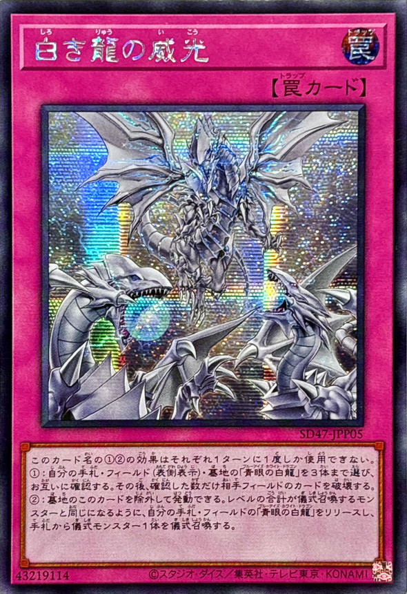 白き龍の威光 通常罠 このカード名の(1)(2)の効果はそれぞれ1ターンに1度しか使用できない。 (1):自分の手札・フィールド(表側表示)・墓地の「青眼の白龍」を3体まで選び、お互いに確認する。 その後、確認した数だけ相手フィールドのカードを破壊する。 (2):墓地のこのカードを除外して発動できる。 レベルの合計が儀式召喚するモンスターと同じになるように、 自分の手札・フィールドの「青眼の白龍」をリリースし、手札から儀式モンスター1体を儀式召喚する。