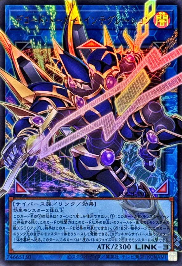 デコード・トーカー・インテグレーション リンク・効果モンスター リンク3/闇属性/サイバース族/攻2300 【リンクマーカー:上/左下/右下】 効果モンスター2体以上 このカード名の(2)の効果は1ターンに1度しか使用できない。 (1):このカードがEXモンスターゾーンに存在する限り、 このカードの攻撃力はこのカード以外のお互いのフィールド・墓地のLモンスターの数×500アップし、 相手はこのカードを効果の対象にできない。 (2):自分・相手ターンに、このカードのリンク先の自分のモンスター1体をリリースして発動できる。 EXデッキからサイバース族モンスター1体を墓地へ送る。 このターン、このカードは1度のバトルフェイズ中に2回までモンスターに攻撃できる。