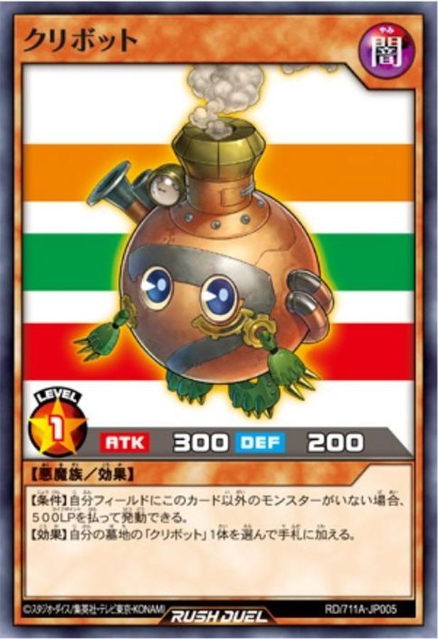効果モンスター 星1/闇属性/悪魔族/攻 300/守 200 【条件】自分フィールドにこのカード以外のモンスターが存在しない場合、 500LPを払って発動できる。 【効果】自分の墓地の「クリボット」1体を選んで手札に加える。